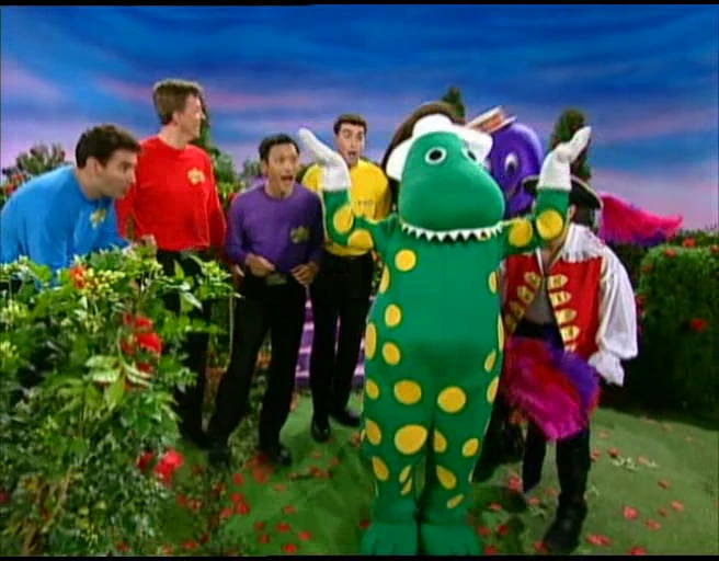 (Later, a bee is look at the screen transition to Dorothy's garden, after chattering about the plan, The Wiggles agree. Then, Captain Feathersword, Henry and Wags arrive.)