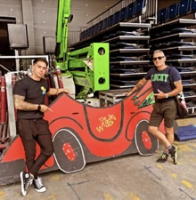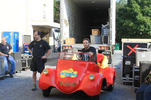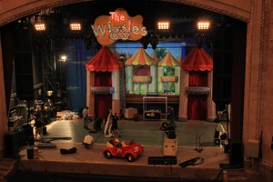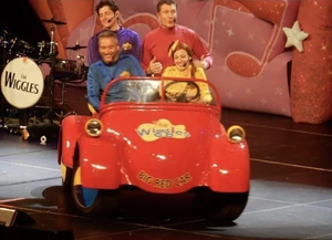 During a performance of the Wiggle Pop! Big Show at the RAC Arena in Perth, a Taylor-Dunn electric utility vehicle is used to represent the Big Red Car - it is covered in red duct-tape and cardboard, with The Wiggles logo being printed on A4 paper and taped on the sides and front.
