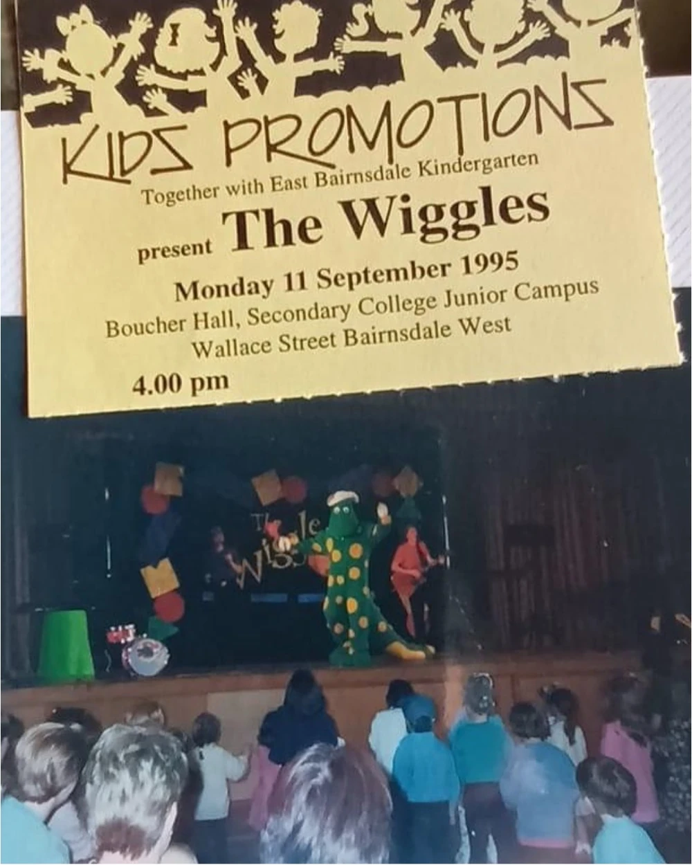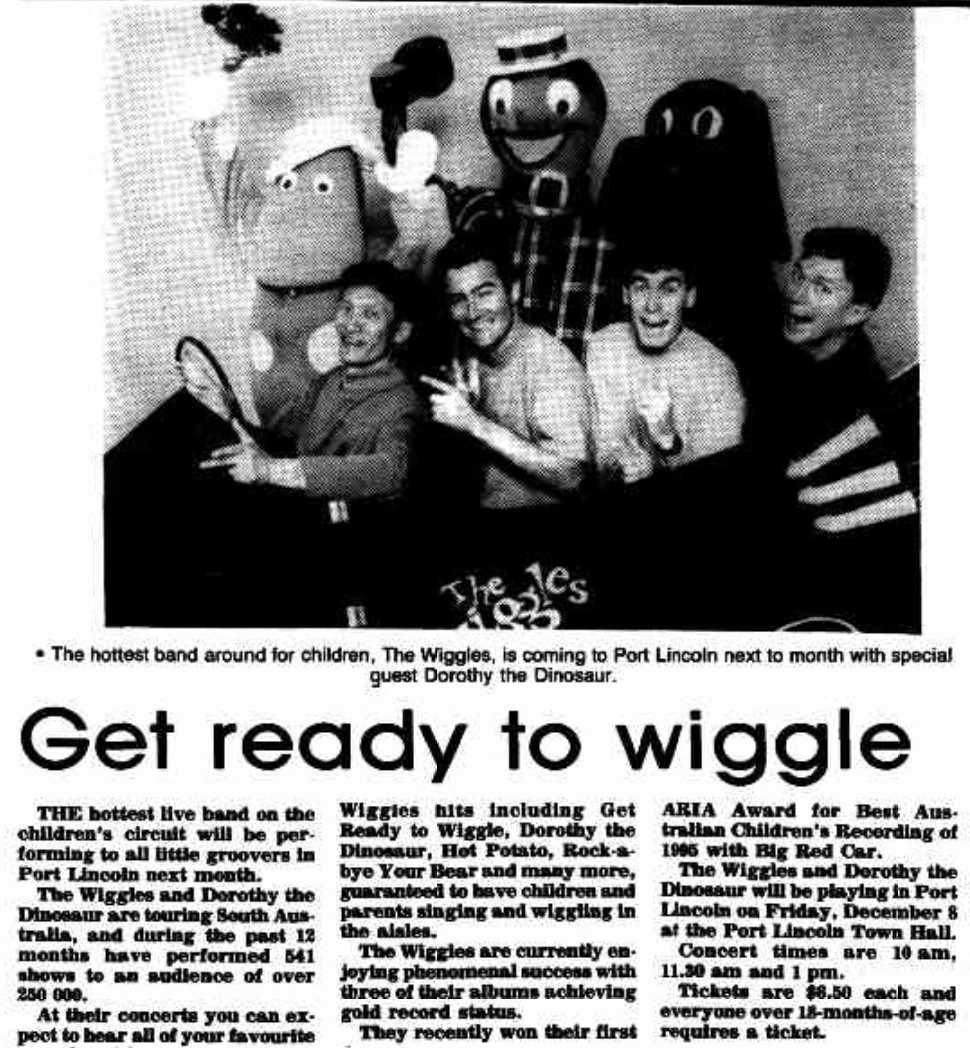 - Unknown dates between 1 April-13 April and 24 April-28 May 1995 - Australia's Wonderland, Sydney NSW (Note: The Wiggles performed at ABC For Kids Concerts with Monica Trapaga, Incy Wincy, Blinky Bill, Postman Pat and more between these dates as part of Kidz Fest '95)