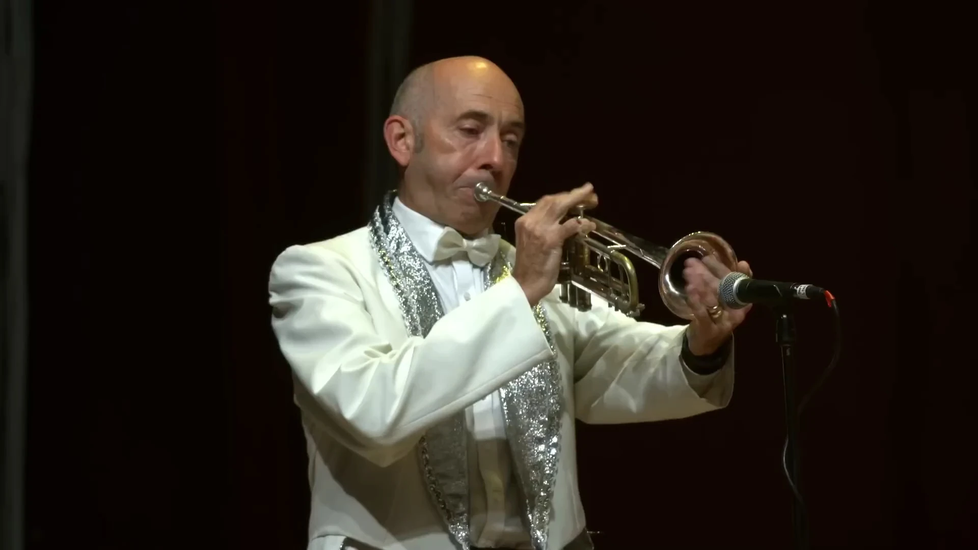 Lindsay playing a trumpet solo during a live performance of "Do the Skeleton Scat!".