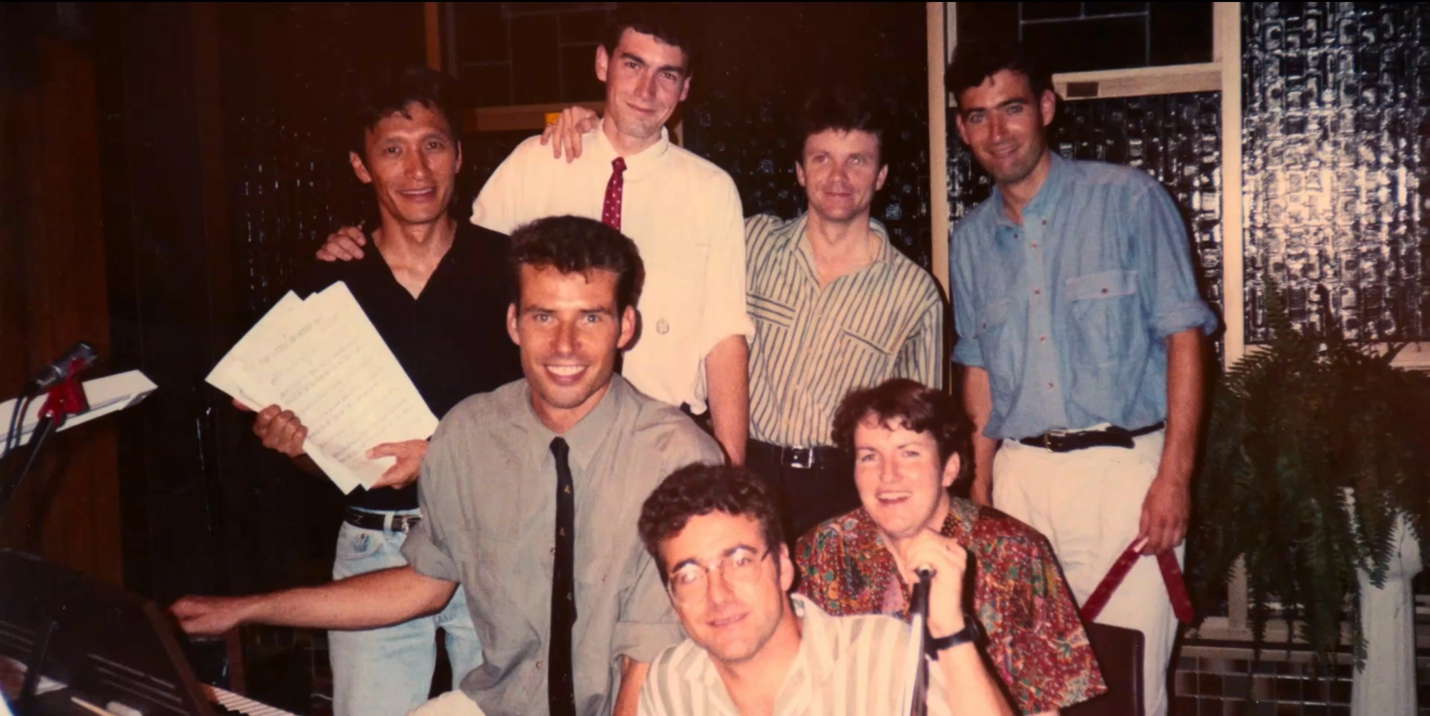 Field (second row, left) and the band during sessions for the self-titled debut.