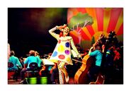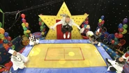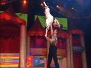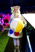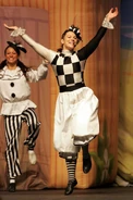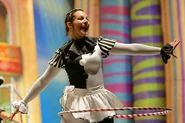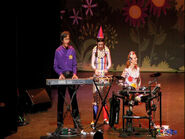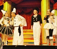 By late 2007, the dancers also started appearing in a variety of outfits inspired by traditional circus clowns. There were two main sets of these costumes with different color schemes: one in black and white, and another in white and the four main Wiggle colors. The black and white outfits were seen during concerts from 2007-2009 and appeared in Hot Poppin Popcorn, Let's Eat!, and Ukulele Baby!, while the white and Wiggle-colored outfits were seen during concerts from 2011-2013 and appeared in Go Santa Go! and Apples and Bananas.